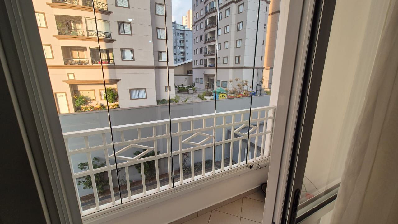 ampla sala 2 ambientes com  rack e painel com sacada envidraçada